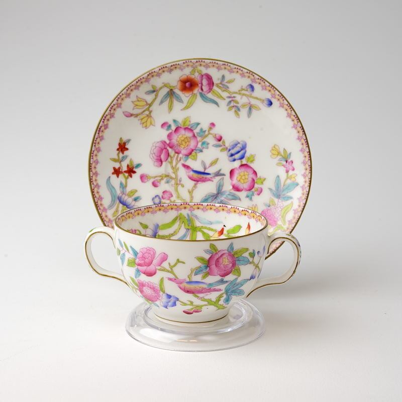 ロイヤルドルトンのカップソーサー。珍しいフィラデルフィアの高級宝石商、「Bailey Bank&Biddle ベイリーバンクビドル」の別注モデル。ダブルハンドルで、ハンドル部分にも細かい絵付けが施された大変美しいカップです。ミントンなどにも似た華やかでエレガントな雰囲気。おススメです!