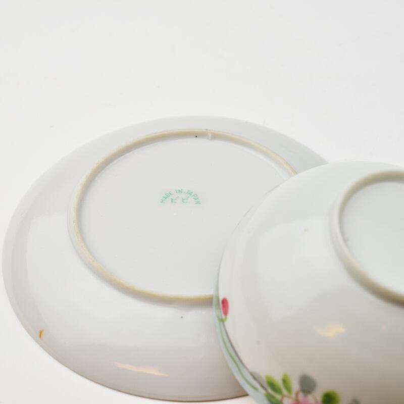 レトロな雰囲気いっぱいのカップソーサー。昭和のはじめに海外へ輸出された日本製のものです。昭和の海外輸出用のものはノリタケなどのを除いて雑な作りのものが多いのですが、これは色使いも優しく柔らかい雰囲気でとても素敵です。「ビビ メイドインジャパン」の銘があります。