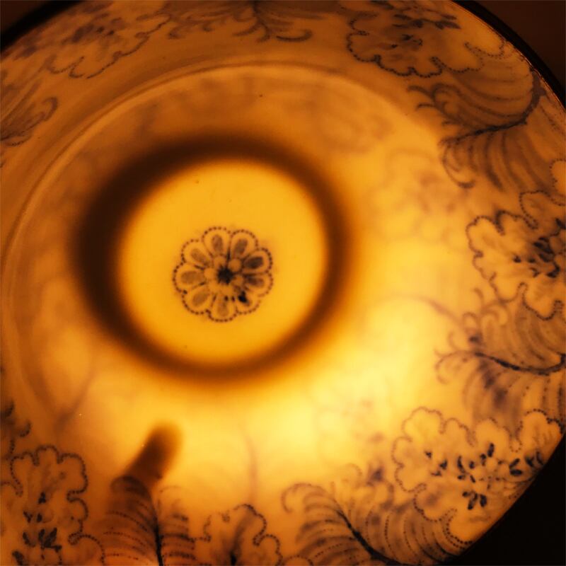優しいブルーの色合いと情緒漂う東洋的なデザイン、薄く繊細で儚いような雰囲気が大変美しい、1800年代コールドンのティーカップ&ソーサーです。