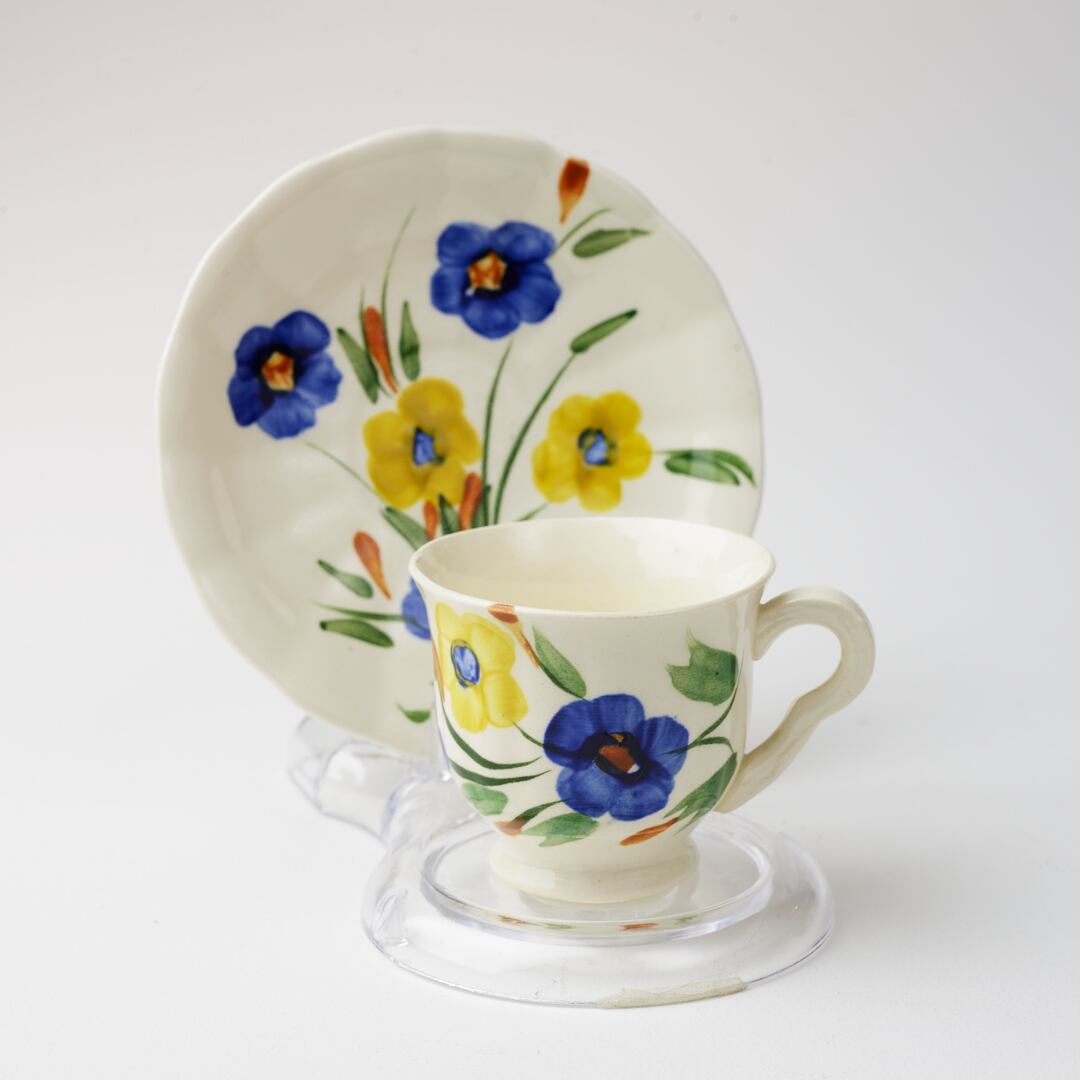 紺と黄色の草花柄が優しい雰囲気のデミタスカップです。