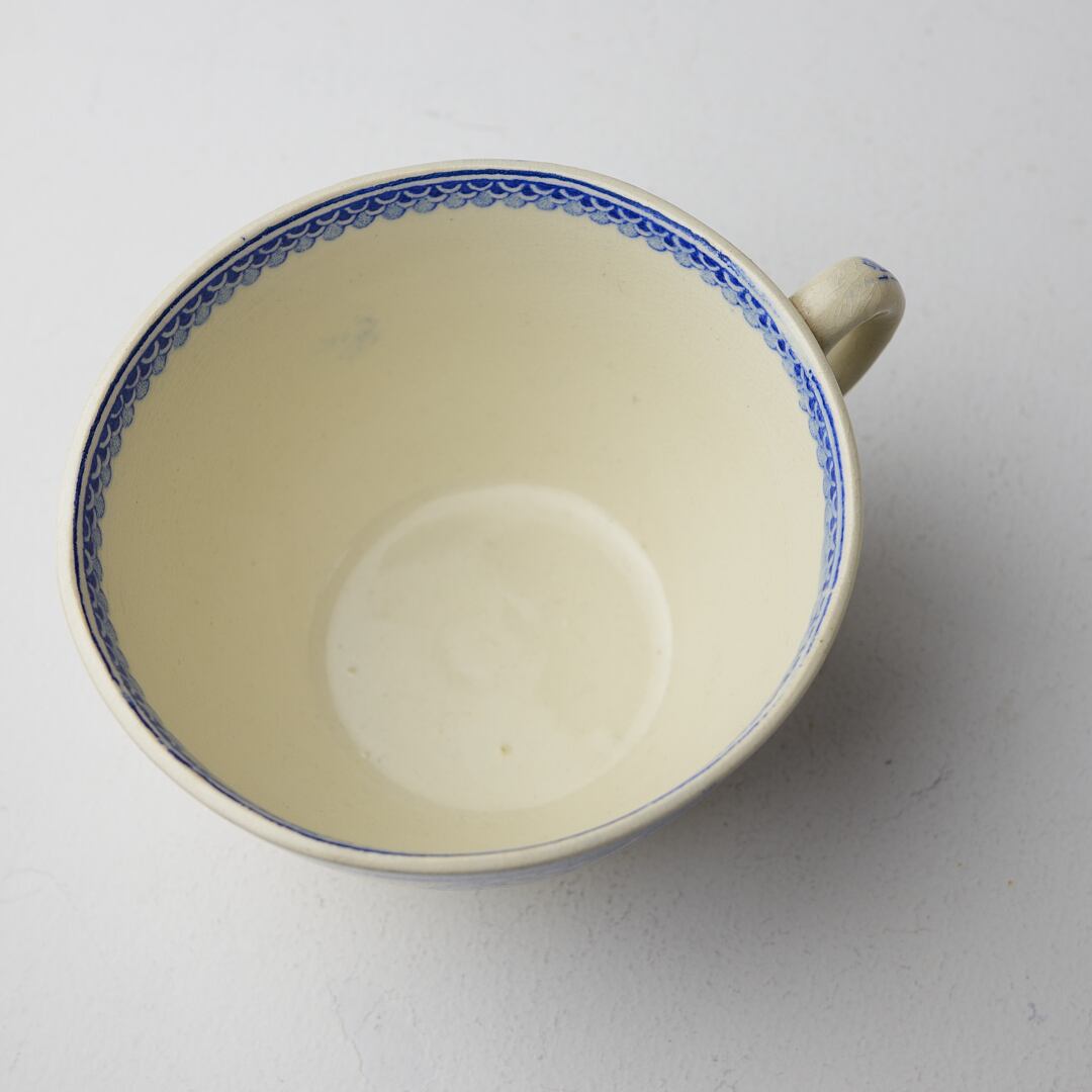 カップ:素地の歪み、汚れがあります。焼成時にカップ底に素地の粒がくっついています。転写のズレや消え、インクのにじみなどが見られます。